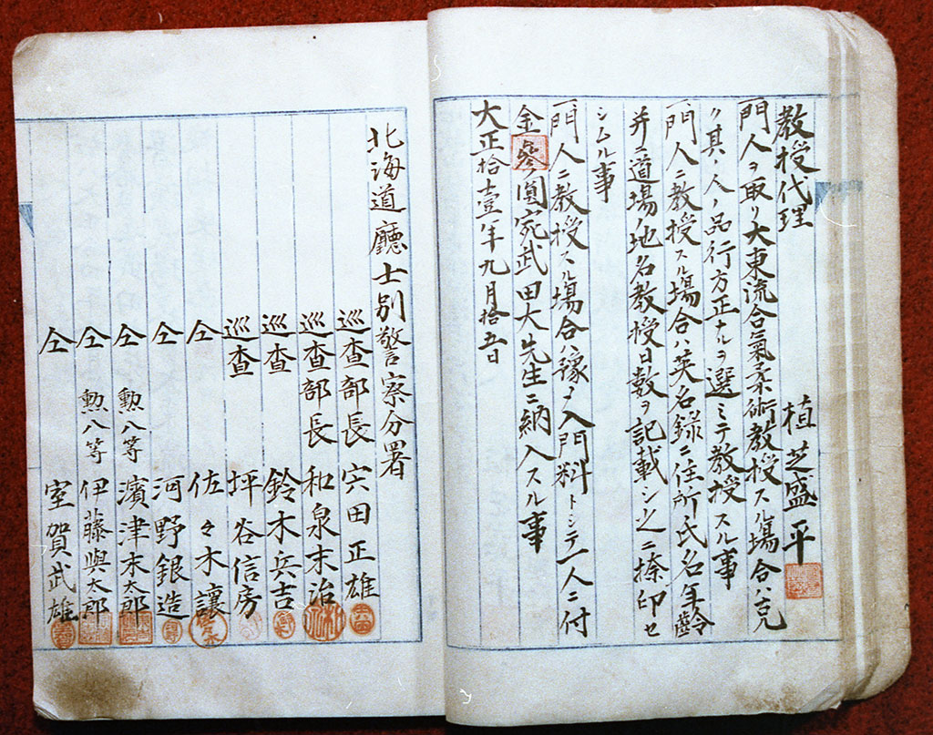 Extrait du eimeiroku de Takeda Sokaku montrant qu'il a attribué le kyoju dairi à Ueshiba Morihei le 15 septembre 1922. Le texte faisant référence aux arrangements monétaires dit : « Lors de l'inscription d'un élève, un paiement initial de trois yen doit être versé à Takeda Dai-Sensei, à titre de frais d'inscription ».