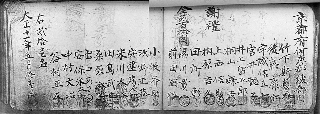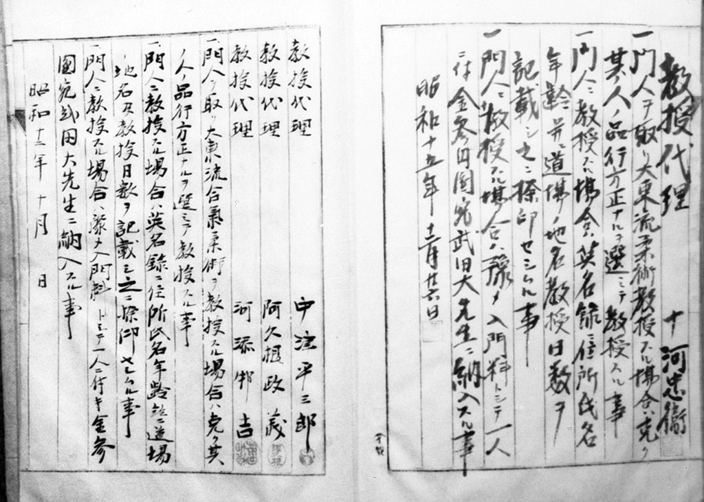 Extrait de l'eimeiroku de Takeda Sokaku montrant qu'il a attribué le kyoju dairi à Nakatsu Heizaburo, Akune Masayoshi et Kawazoe Kuniyos en octobre 1937. Le texte faisant référence aux arrangements monétaires dit : « Lors de l'inscription d'un élève, un paiement initial de trois yen doit être versé à Takeda Dai-Sensei, à titre de frais d'inscription ».