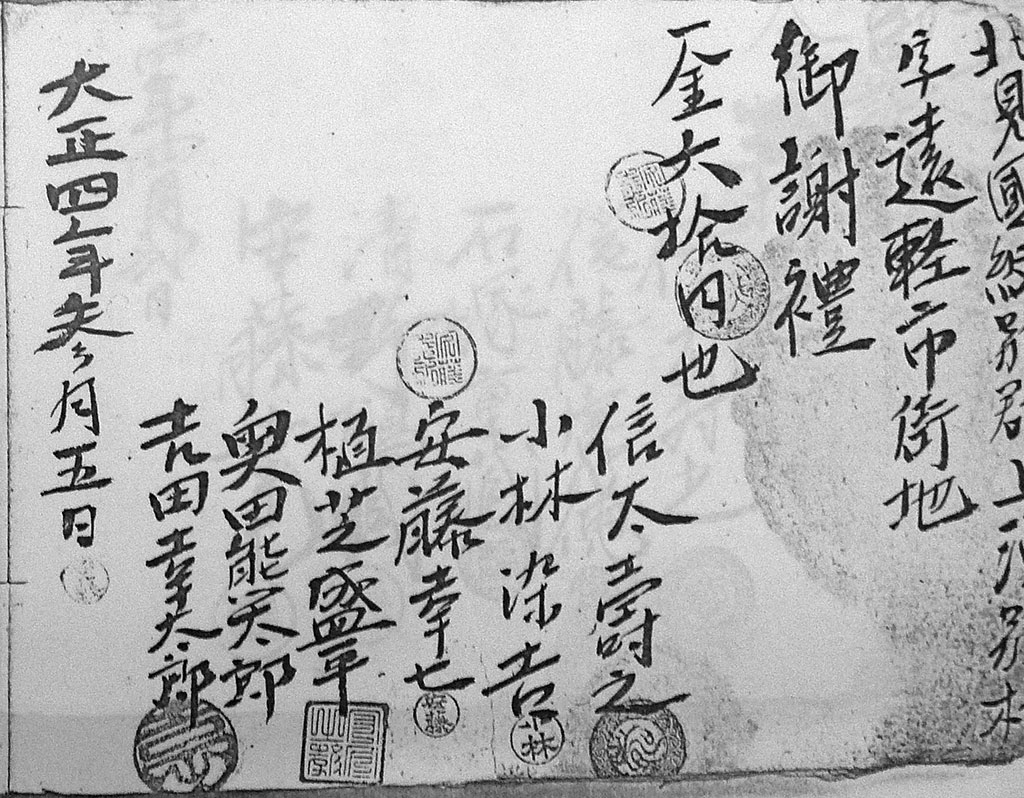 Les frais de stages sont aussi un indicateur de la valeur de l’argent aux yeux de Takeda Sokaku et d'Ueshiba Morihei. Ci-dessous, deux shareiroku (謝礼禄, fiches d'inscription aux stages) de Takeda Sokaku. Celui du haut énumère six personnes, dont Ueshiba Morihei, pour un prix total de 60 yens, et celui du bas énumère 21 personnes pour 210 yens, soit 10 yens par tête.Mes remerciements vont encore à Josh Gold, Guillaume Erard et Christopher Li..