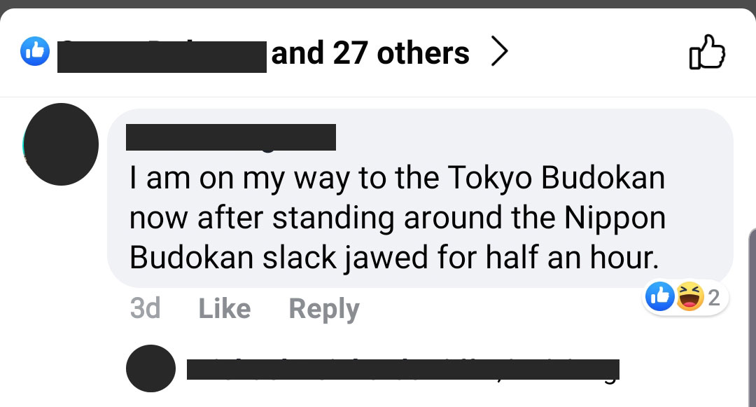 Les passionnés de kobudo ont effectivement dû se rendre un peu plus au nord de Tokyo que d'habitude, jusqu'au quartier d'Adachi où se trouve le Tokyo Budokan. Je me suis rendu pour la première fois au Tokyo Budokan en 2012 lorsque j'ai couvert sa réouverture après d'importants travaux de rénovation. En raison de la similitude du nom, on pourrait être pardonné de le confondre avec le Nippon Budokan, situé dans le quartier Chiyoda, ce que font souvent les gens d'ailleurs, comme le suggère ce post sur Facebook :